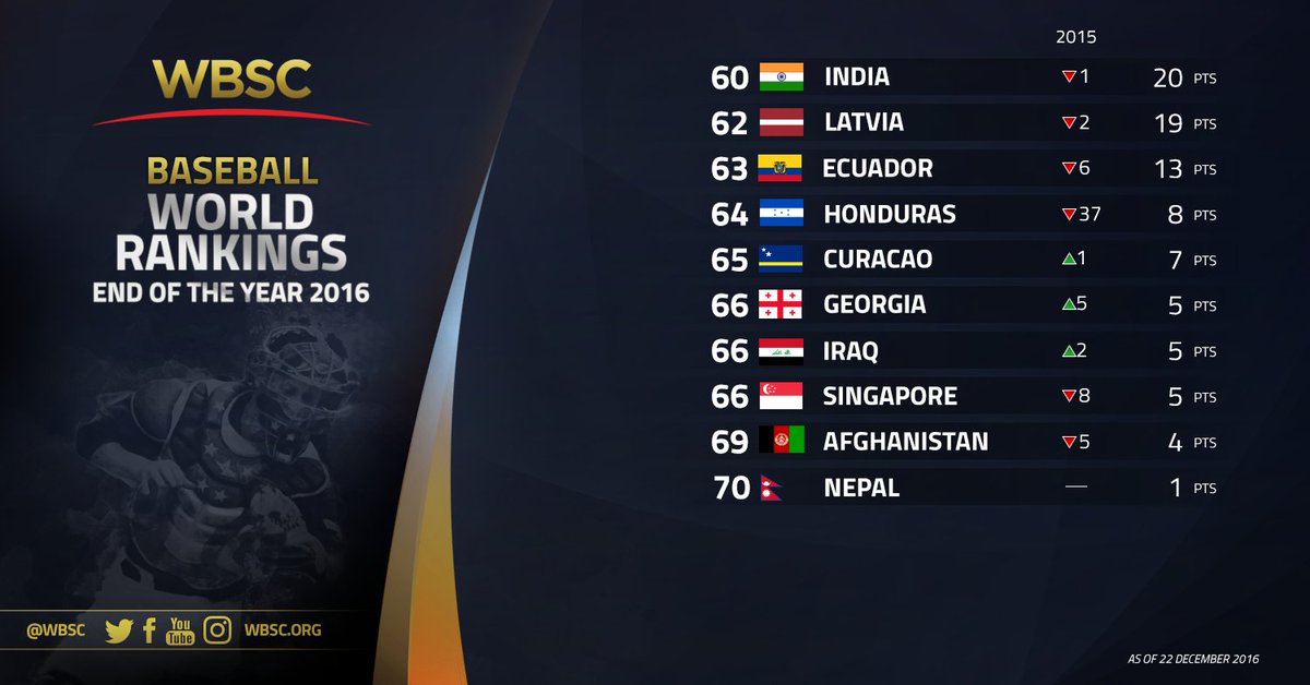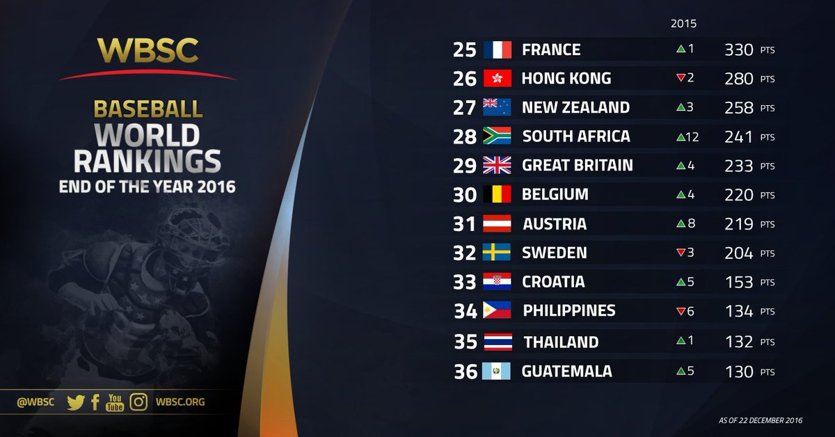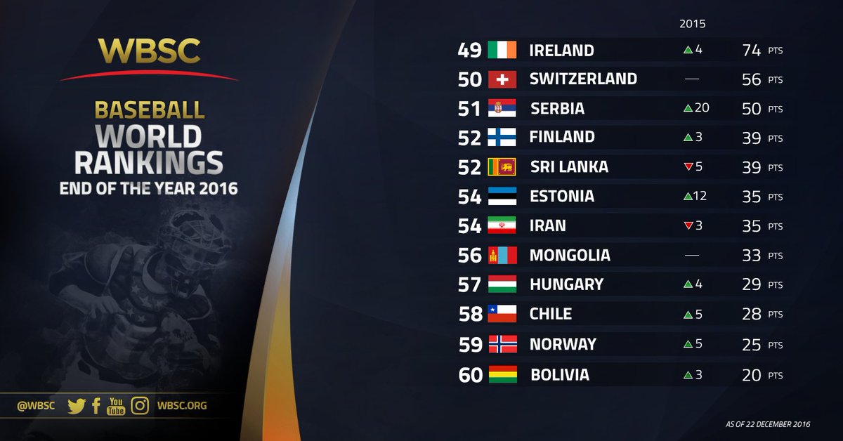Serpentineros.com (22 de diciembre de 2016).- La Confederación Mundial de Béisbol y Sóftbol (WBSC, por sus siglas en inglés) relevó el día de hoy la última clasificación mundial del 2016 del Ranking Mundial de Béisbol.