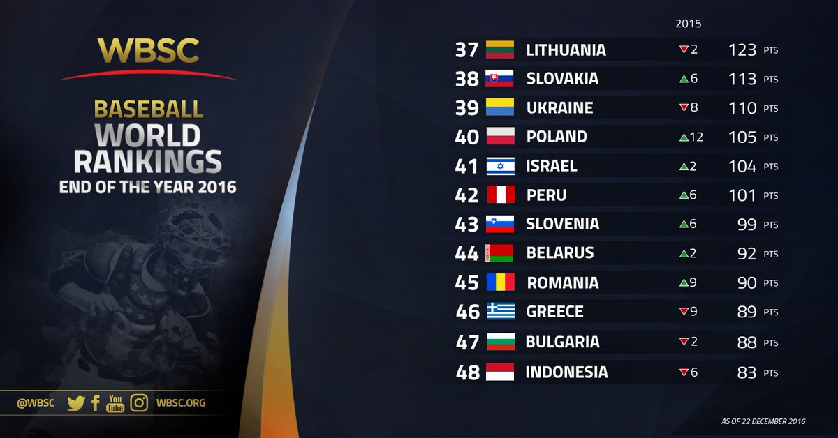 El crecimiento reciente del béisbol a nivel mundial y el aumento de la popularidad de las competencias de selecciones nacionales, crearon un movimiento récord en 2016; haciendo que 60 de los 70 países del ranking subieran o bajaran en la clasificación.